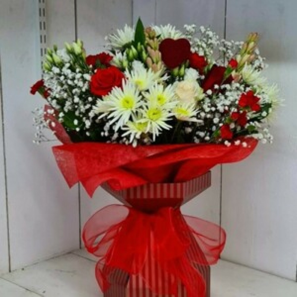 Boxed Bouquet full of seasonal flowers and foliage that shouts I Love You