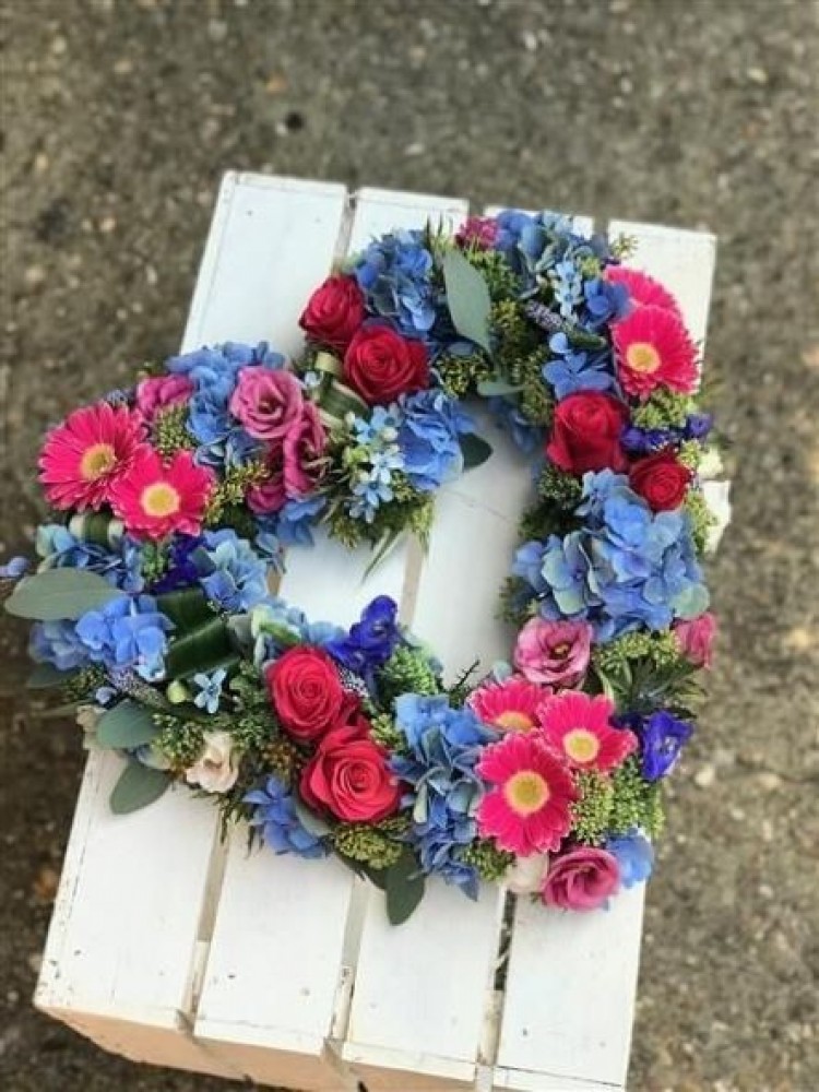 Abeautiful open heart made with a selection of pink and blue flowers specialy chosen to make a stunning tribute